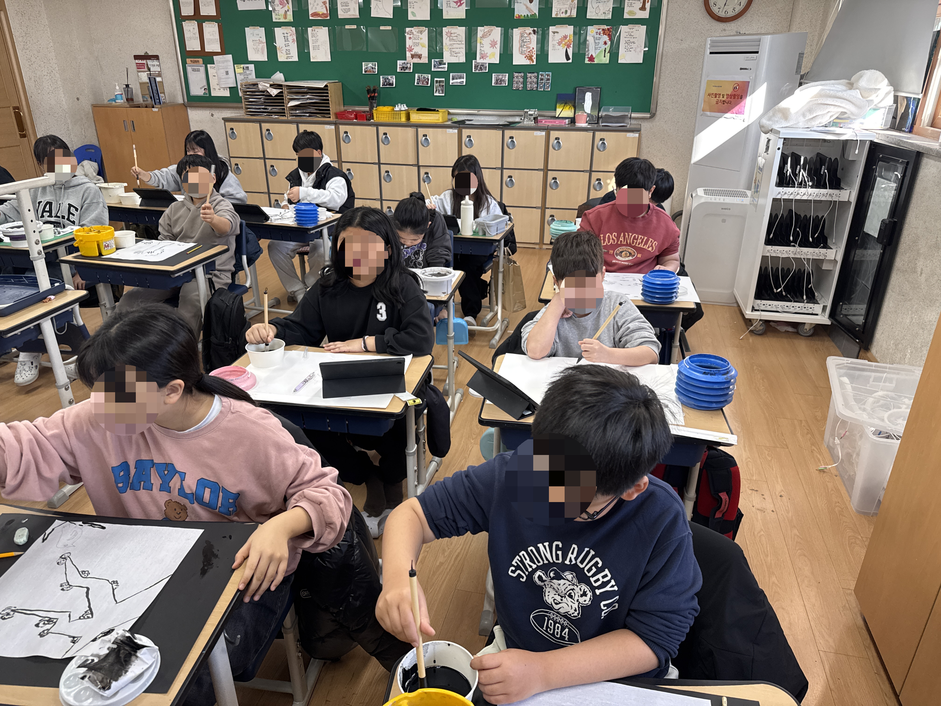 이번에 수묵담채화를 먹물을 활용해 선을 그리고, 노마르지 사인펜으로 채색하는 수업을 진행했다. 내가 느낀 바로는 한국화를 위해서는 미술실이 꼭 있어야겠다는 점이다. 먹물을 정리하다가 화장실이 정말 난장판이 된다. 내가 일일이 정리하는 것도 어려운데다가 아이들한테 맡긴다고 해도 뒤처리가 정말 답이 없다. 차라리 먹물 물 드는 것을 감안하고 쓸 수 있는 미술실을 이용하는 게 좋지 않을까 하는 생각이다. 전담으로 미술 선생님을 두는 것도 괜찮겠다는 점도 생각했지만 그 필요성이 과학, 영어보다는 낮기에 이 생각은 접어두는 걸로... (물론, 내실화가 잘 되면 좋겠지만..)