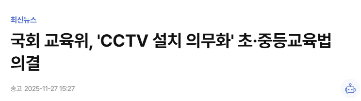 지난 11월 27일, 국회 교육위원회에서 교실 내 CCTV 설치 허용을 골자로 하는 '초·중등교육법 개정안'이 의결되었습니다. 해당 법안은 학교장의 제안이 있을 시 학교운영위원회 심의를 거쳐 교실 내부에도 CCTV를 설치할 수 있도록 하는 조항을 포함하고 있습니다. 이에 대해 한국교원단체총연합회(교총) 등 교원 단체는 교권 침해 및 교육 현장의 붕괴를 우려하며 강력히 반발하고 있는 상황입니다. 저는 해당 법안이 학교 현장에 미칠 잠재적 부작용과 교육적 우려 사항을 분석해보고자 합니다.